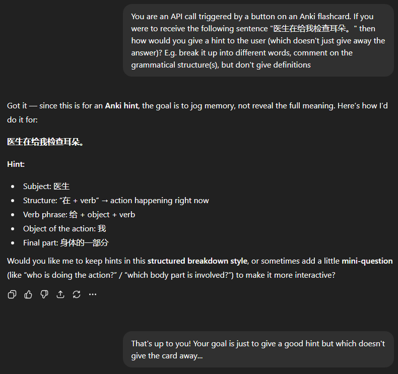 I'm a big fan of customising Anki to optimise learning. ChatGPT is really helpful for explaining tricky Chinese words/phrases, and I thought it would be cool to integrate this directly into the Anki app.